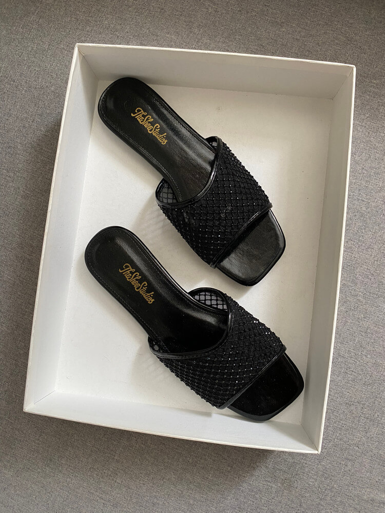 “Slip-On Open Toe Flat Sandals with Mesh Embellished Strap