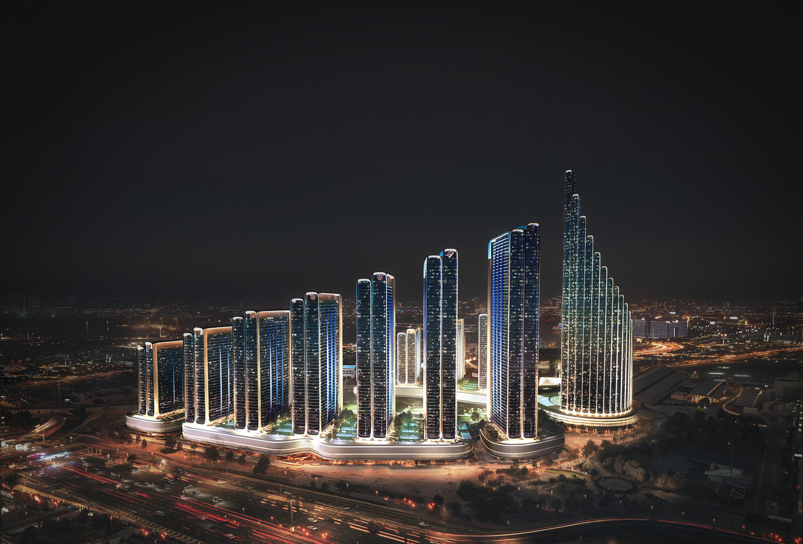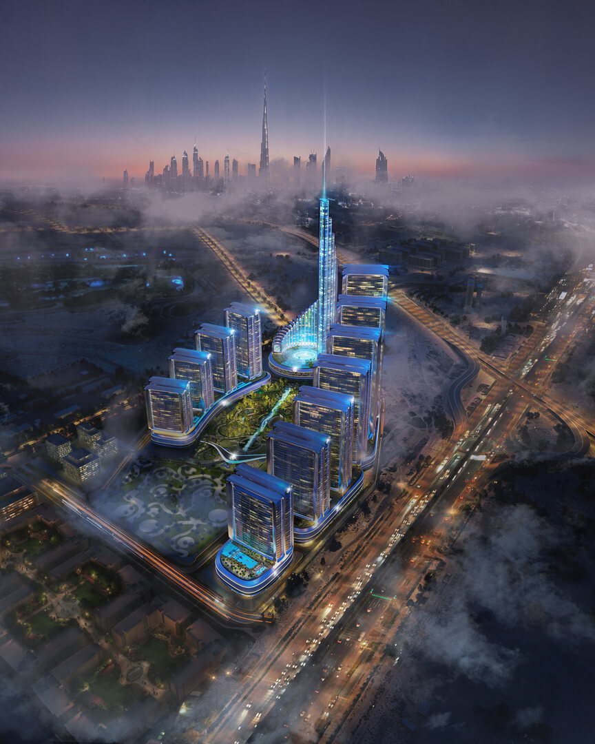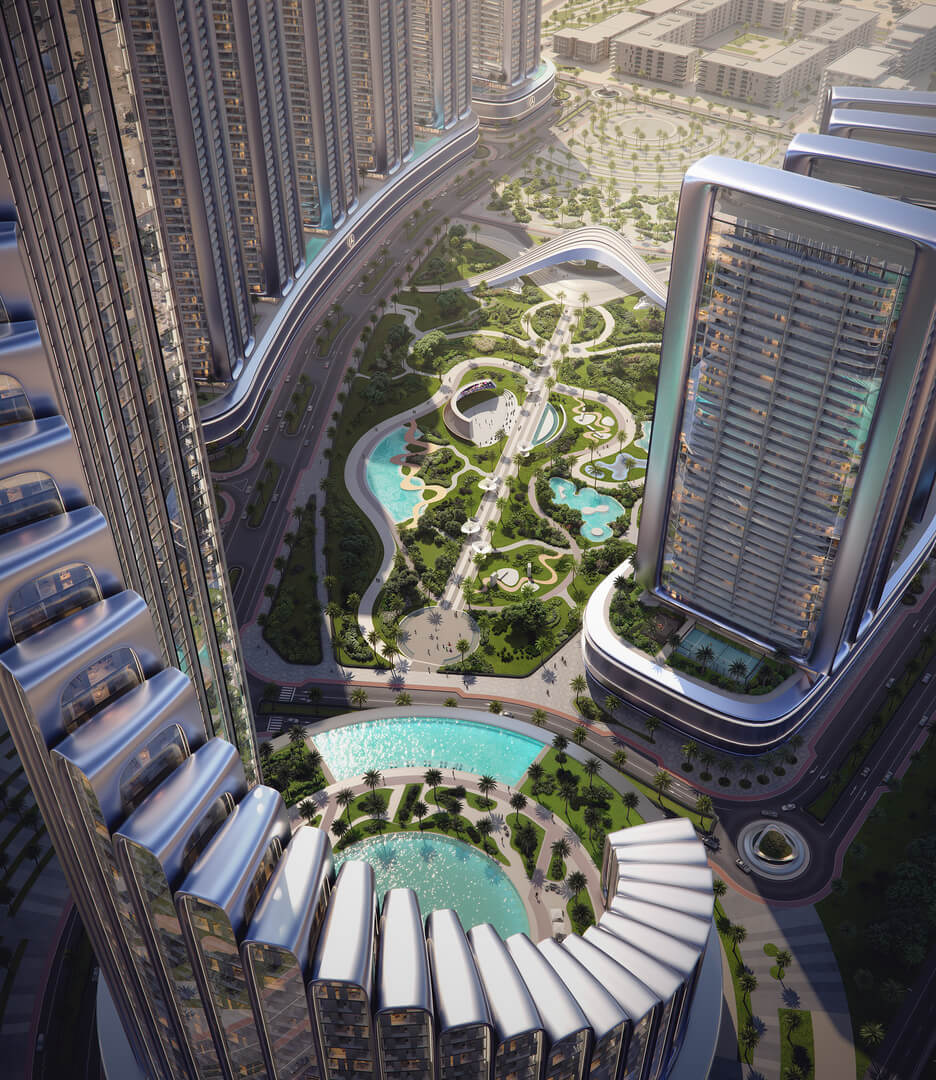 Witness architecture at a monumental scale. Composed of 12 towers of stunning proportion, the city establishes an undeniable presence visible from a distance and unforgettable at first sight. These structures are an exercise in precision engineering, where flowing, sculpted surfaces embody kinetic energy and motion, drawing direct inspiration from the dynamism of Mercedes-Benz performance design